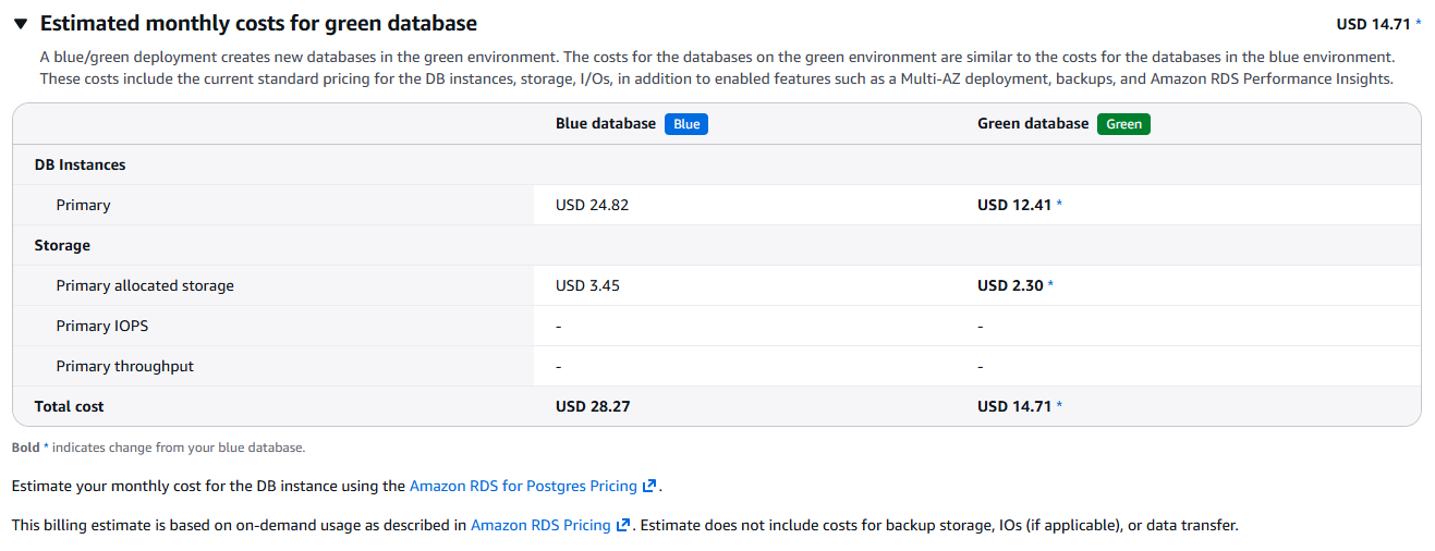 Check the estimated pricing changes to understand the cost impact, then proceed to create the Blue/Green deployment.