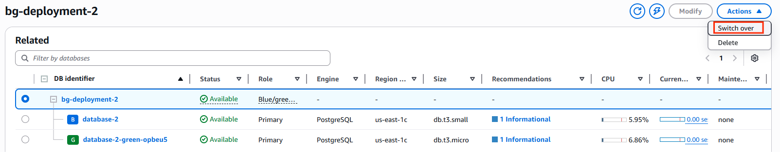 Initiate the switchover by navigating to Actions → Switch over. Configure the timeout settings based on your application’s tolerance for brief connection interruptions.