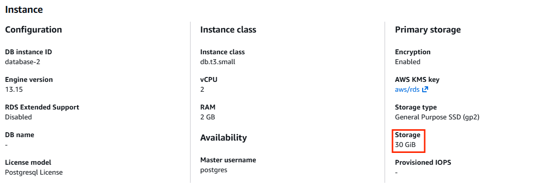 Ensure you have an existing Amazon RDS instance in a healthy state. In this example, an AWS MySQL RDS instance with 30 GB of allocated storage is used as the Blue (production) database.