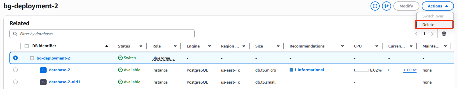After the switchover completes, the original RDS endpoint is reassigned to the Green instance, which now serves as the new production database. Verify application functionality and database connectivity.