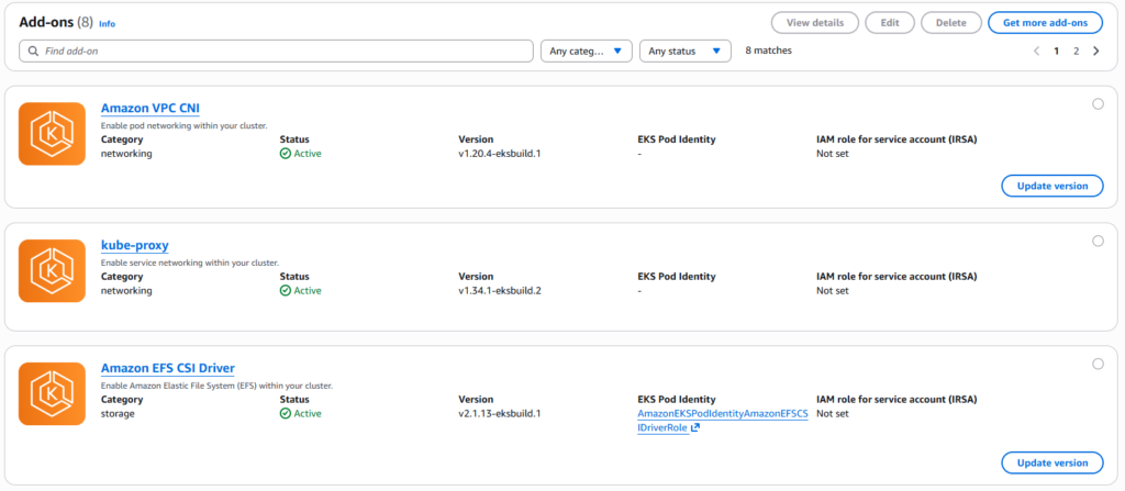 3. Locate the following add-ons: Amazon VPC CNI, KubeProxy, CoreDNS